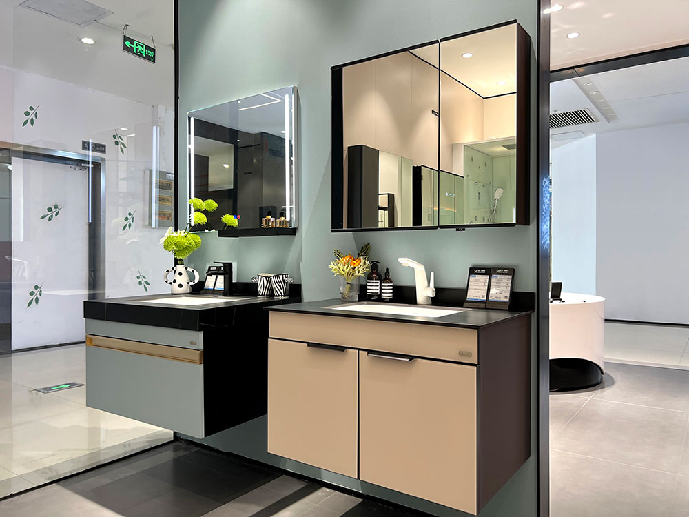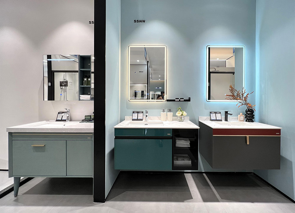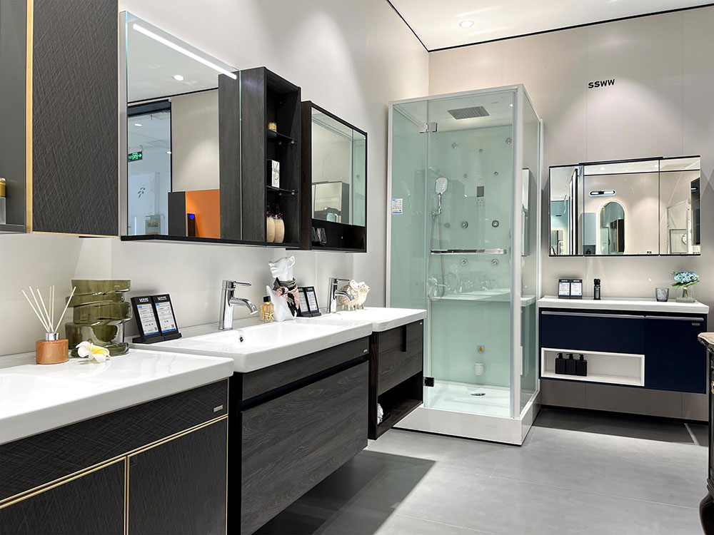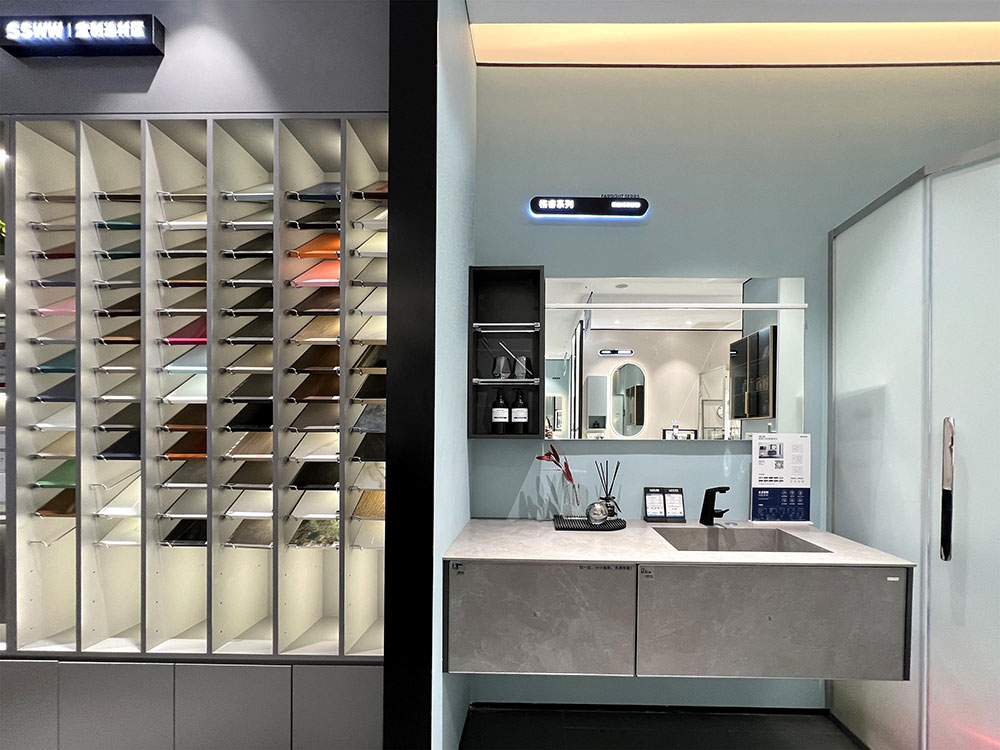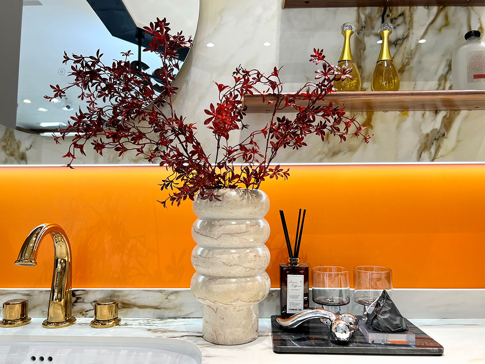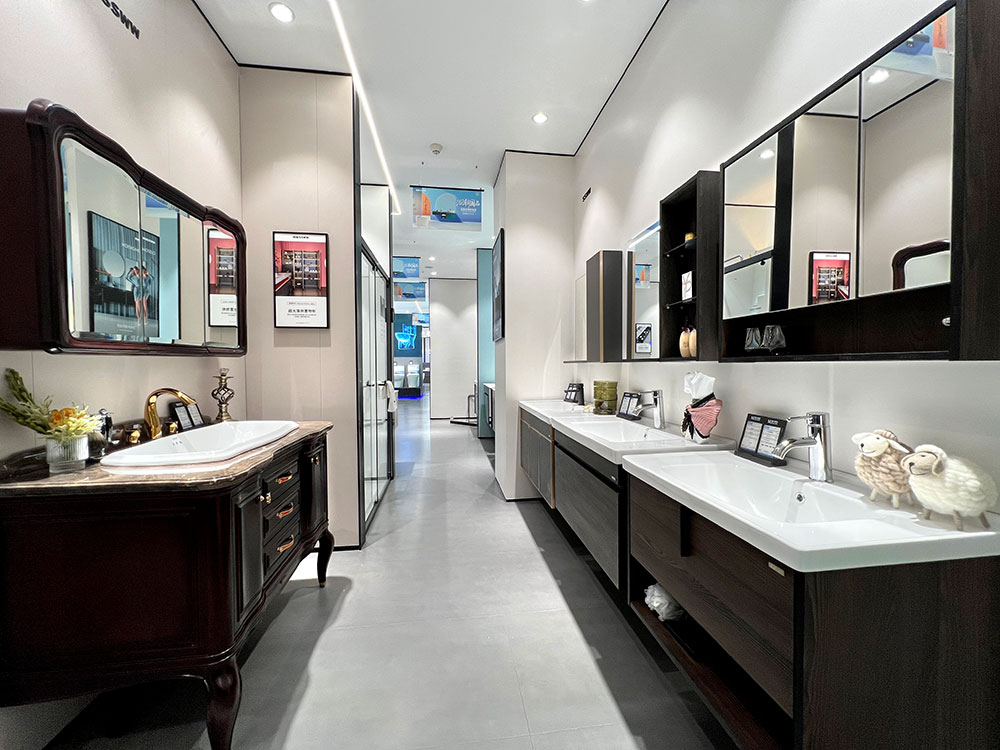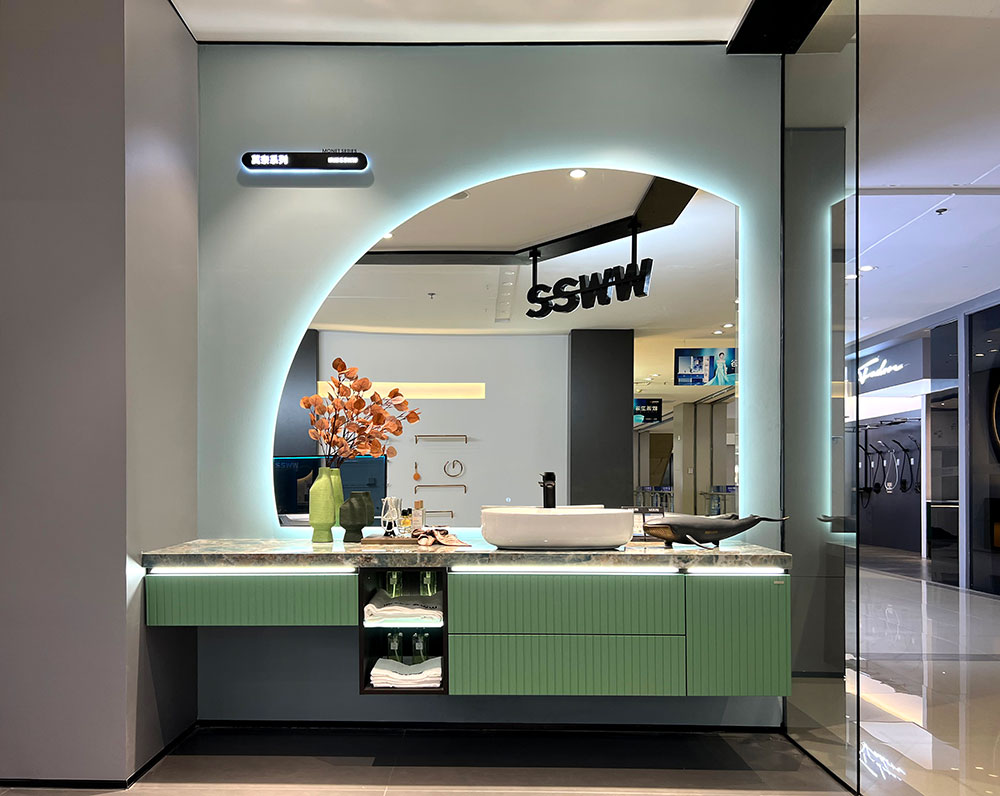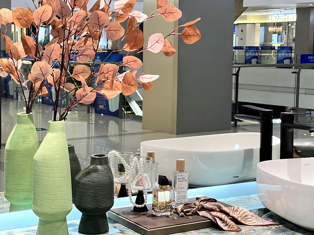 衛(wèi)浴各品類產(chǎn)品的展示,以半獨立的空間區(qū)域劃分,突顯各品類的統(tǒng)一性,同時也更加強調(diào)產(chǎn)品的體驗感。其中,浴室柜展示區(qū)域,配有各種軟裝飾品、擺件,精致、時尚,營造出顧客無法拒絕的精致生活。
