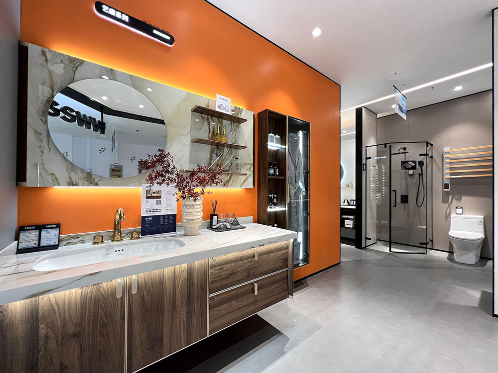 浪鯨衛(wèi)浴合肥政務專賣店的店內(nèi)設計,重塑定制空間的想象。通過個性化定制和撞色搭配,打造不同風格的衛(wèi)浴空間。將洗漱區(qū)+化妝區(qū)+如廁區(qū)+收納區(qū)的大空間組合定制,讓浴室空間具備更強的收納功能與個性化的表達。