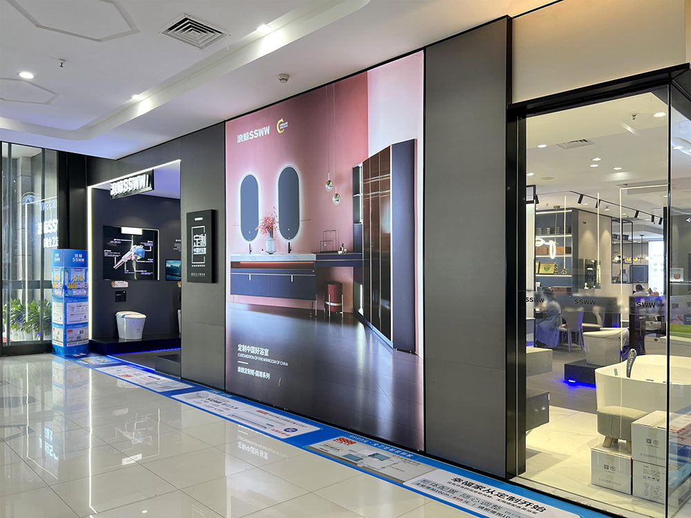 浪鯨衛(wèi)浴武漢歐亞達(dá)品牌專賣店店,門頭外立面標(biāo)志性的品牌logo,吸睛奪目,玻璃櫥窗內(nèi)透出店內(nèi)休閑舒適的直觀體驗(yàn)。商場(chǎng)內(nèi)兩側(cè)入口正對(duì)商場(chǎng)客流聚集之處,因地制宜的設(shè)計(jì)將品牌形象畫面與智能產(chǎn)品一并展現(xiàn)。