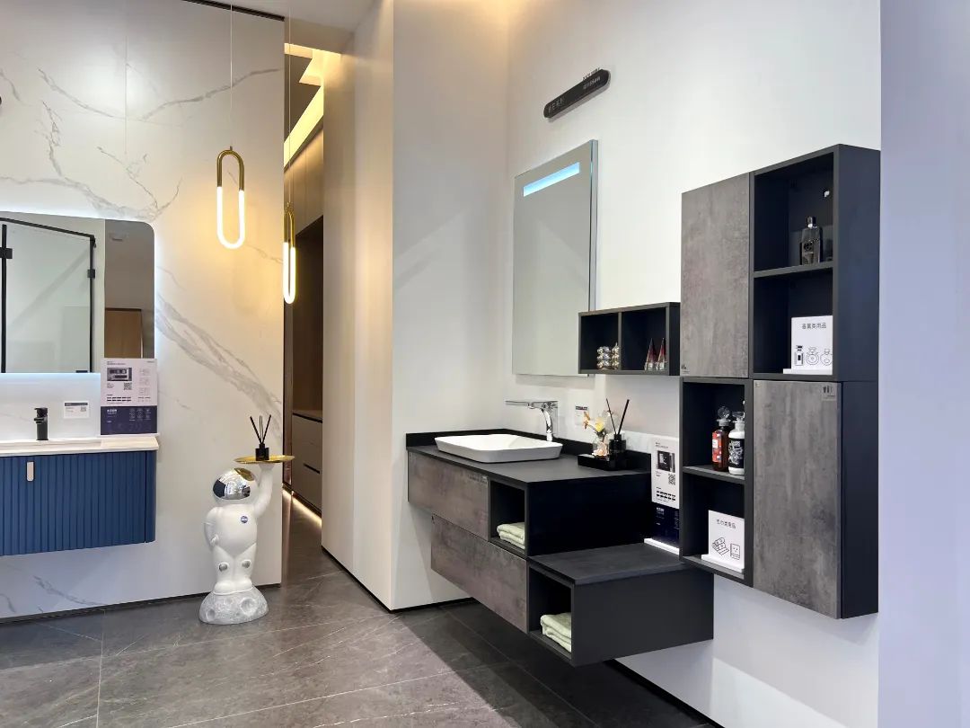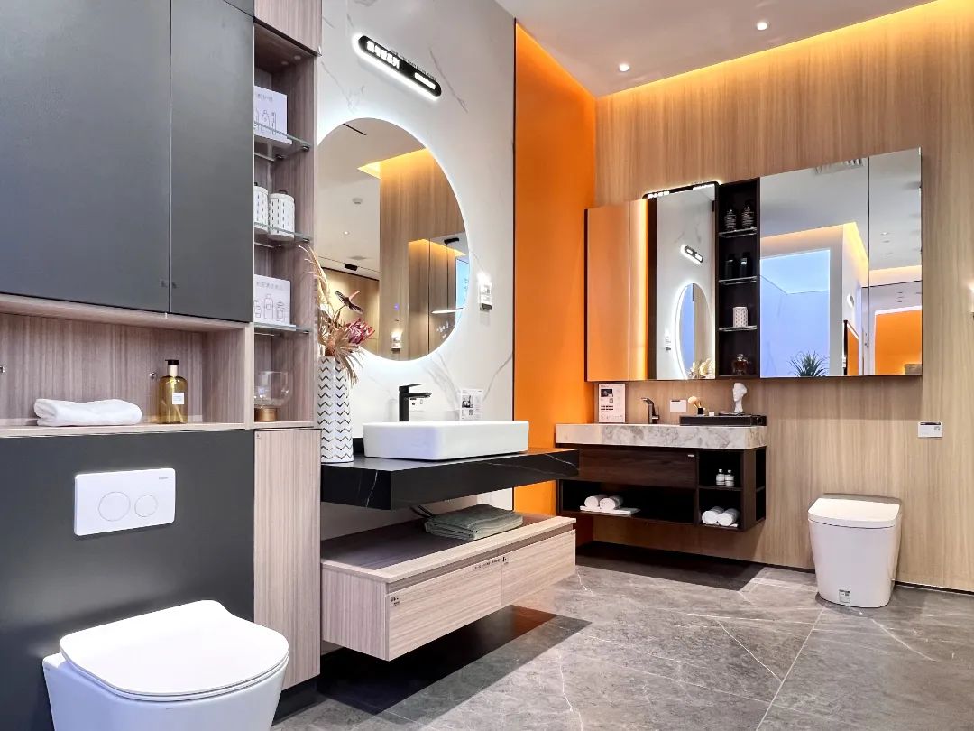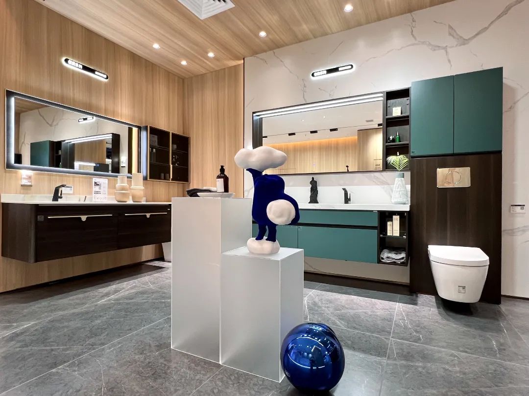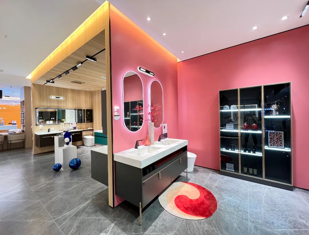 色彩的碰撞應(yīng)用到產(chǎn)品與空間上,洗漱區(qū)+化妝區(qū)+如廁區(qū)+收納區(qū)的大空間組合定制,讓浴室空間具備更強(qiáng)的收納功能與個性化的表達(dá)。