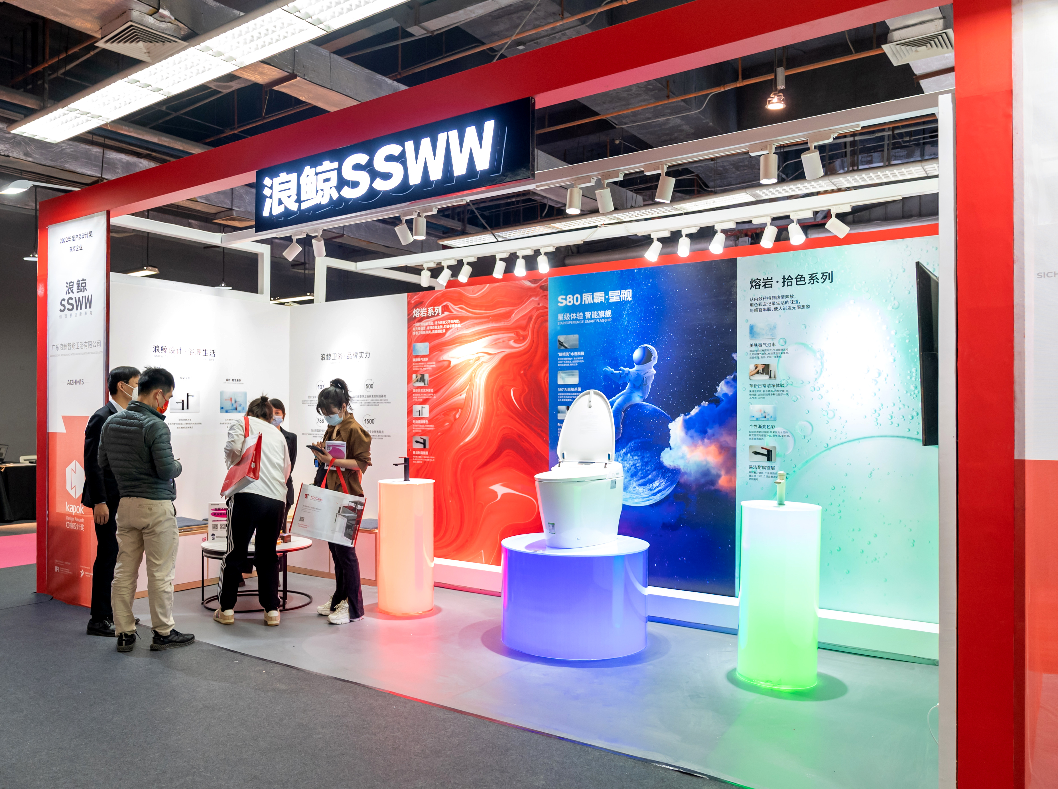 本次展會(huì)上,浪鯨衛(wèi)浴的紅棉設(shè)計(jì)獎(jiǎng)?wù)刮粩[脫傳統(tǒng),通過設(shè)計(jì)鮮艷的色彩,利用區(qū)塊性的色彩背景襯托產(chǎn)品調(diào)性,極具美學(xué)的設(shè)計(jì)語言,為現(xiàn)場的觀展客戶帶來全新的空間體驗(yàn)。