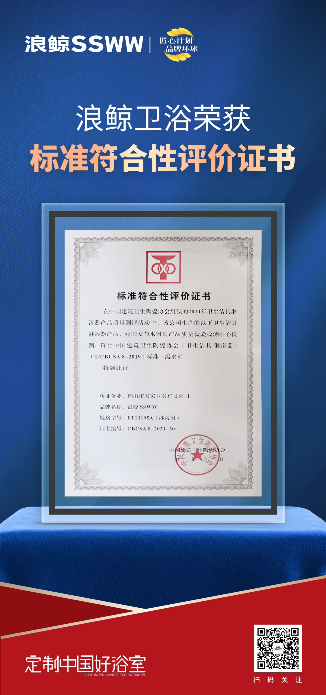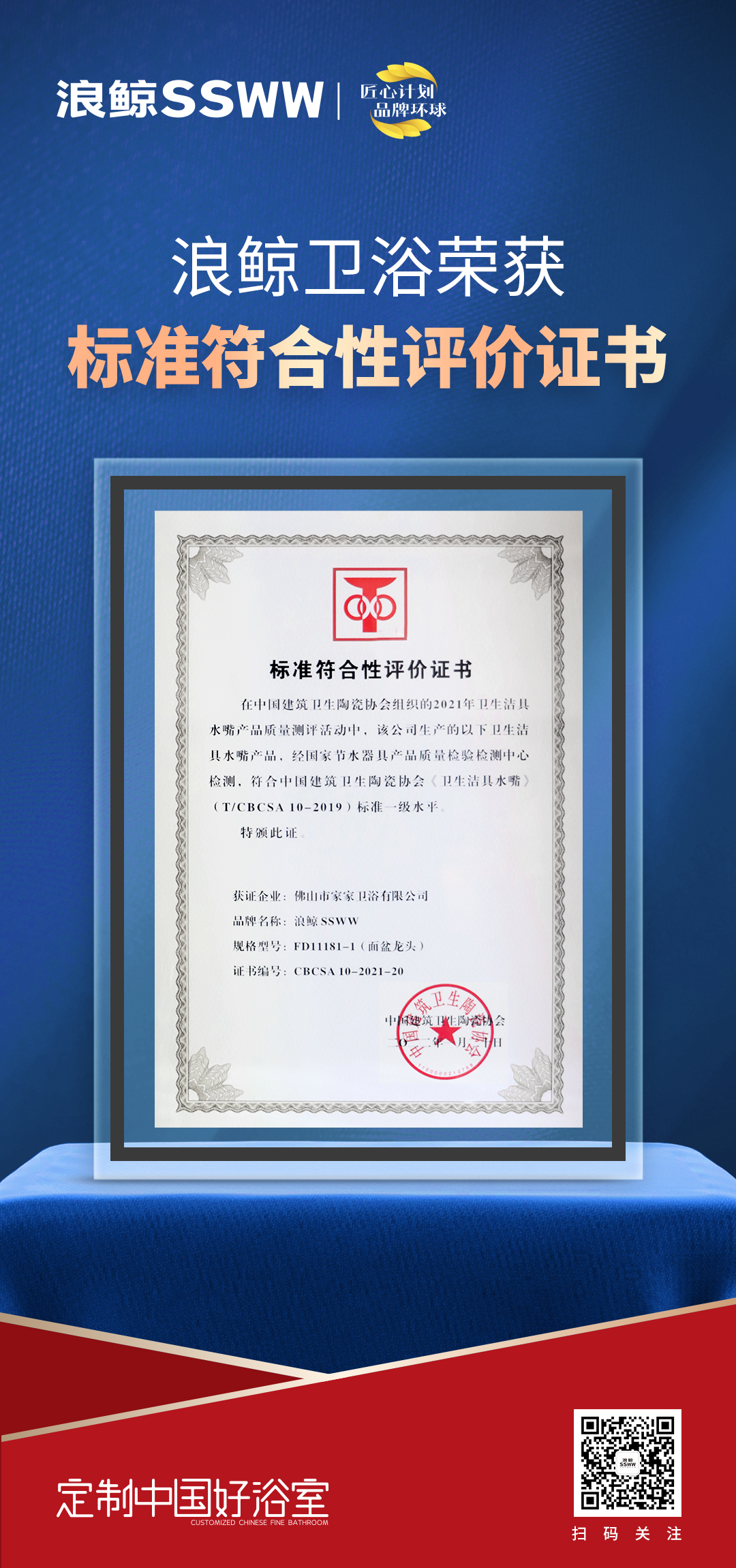 ??2022中國衛(wèi)浴五金產(chǎn)業(yè)發(fā)展論壇上,浪鯨衛(wèi)浴憑借卓越的產(chǎn)品實(shí)力,在2021年衛(wèi)生潔具淋浴器產(chǎn)品質(zhì)量測評活動(dòng)中,浪鯨衛(wèi)浴面盆龍頭(FD11181-1)和淋浴器(FT13195A)兩款產(chǎn)品,經(jīng)國家節(jié)水器具產(chǎn)品質(zhì)量檢驗(yàn)檢測中心檢測,符合中國建筑衛(wèi)生陶瓷協(xié)會(huì)標(biāo)準(zhǔn)一級水平,獲頒《標(biāo)準(zhǔn)符合性評價(jià)證書》榮譽(yù)獎(jiǎng)項(xiàng)。