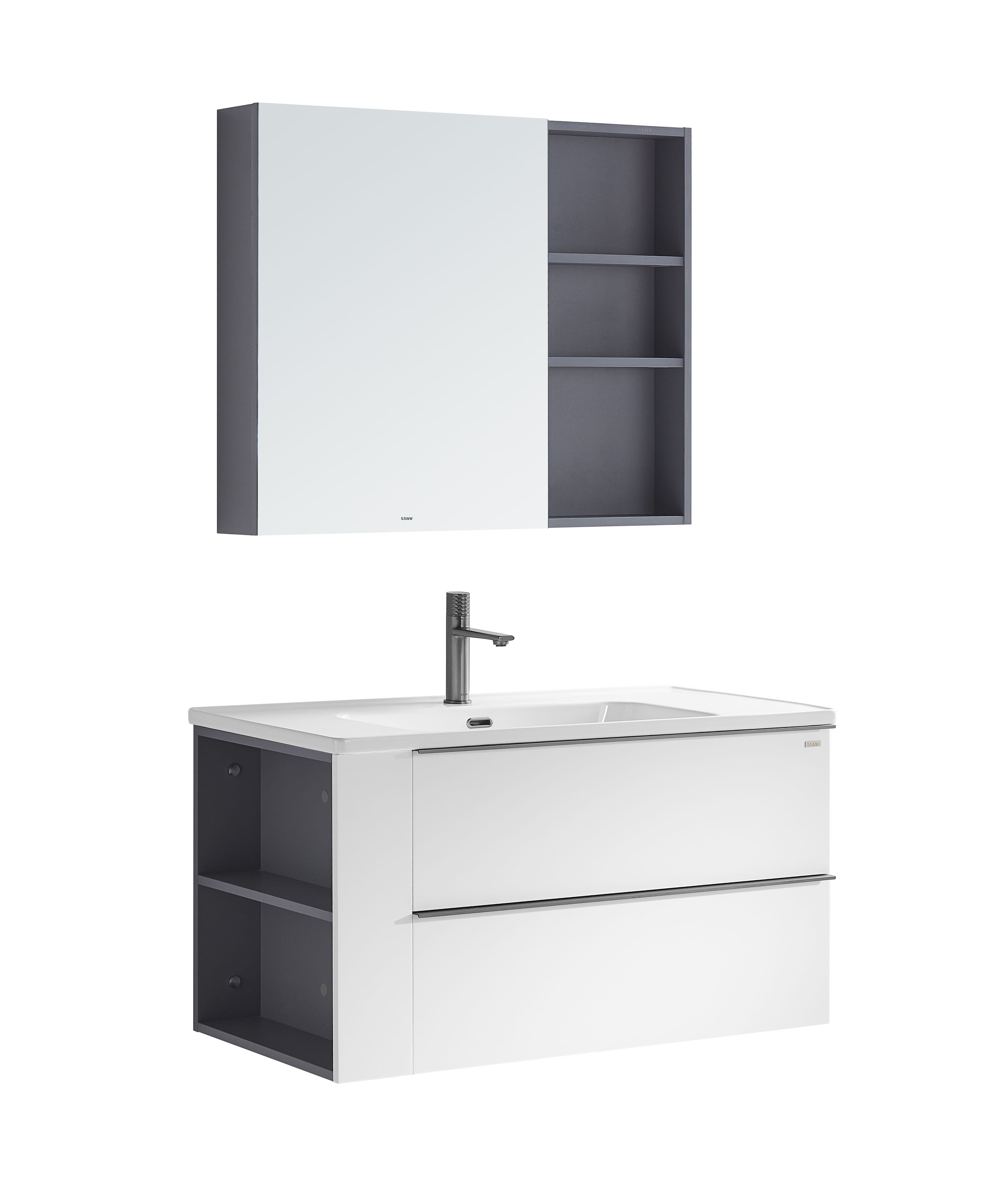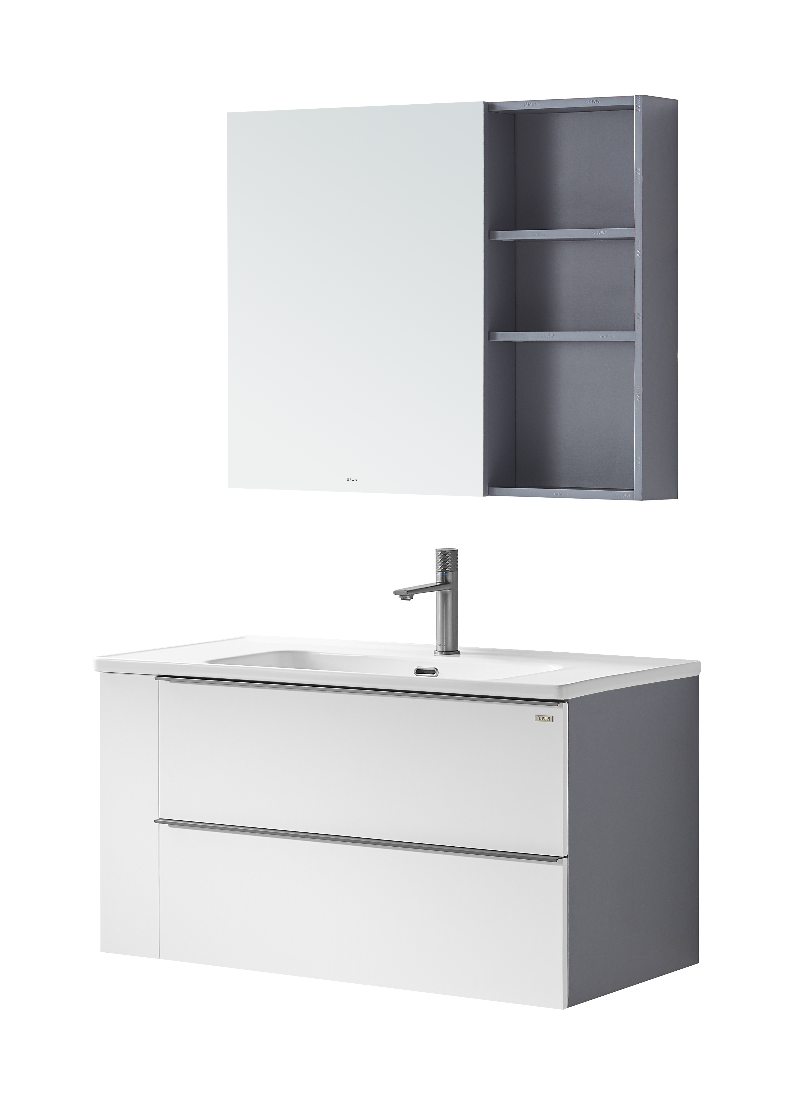 全柜:1010×500×1850mm 主柜:990×488×525mm 鏡柜:900×150×720mm 主色調:愛琴灰/啞光白 材質:多層實木板 陶瓷盆:CL3652/1010×500×200mm
