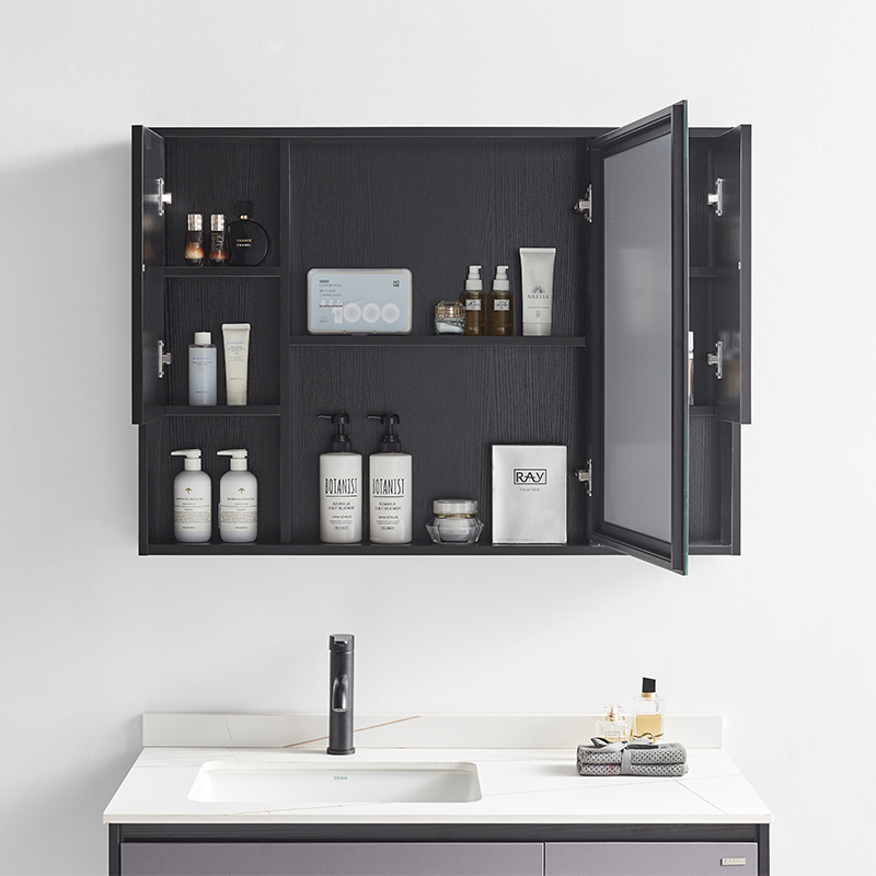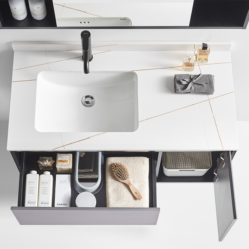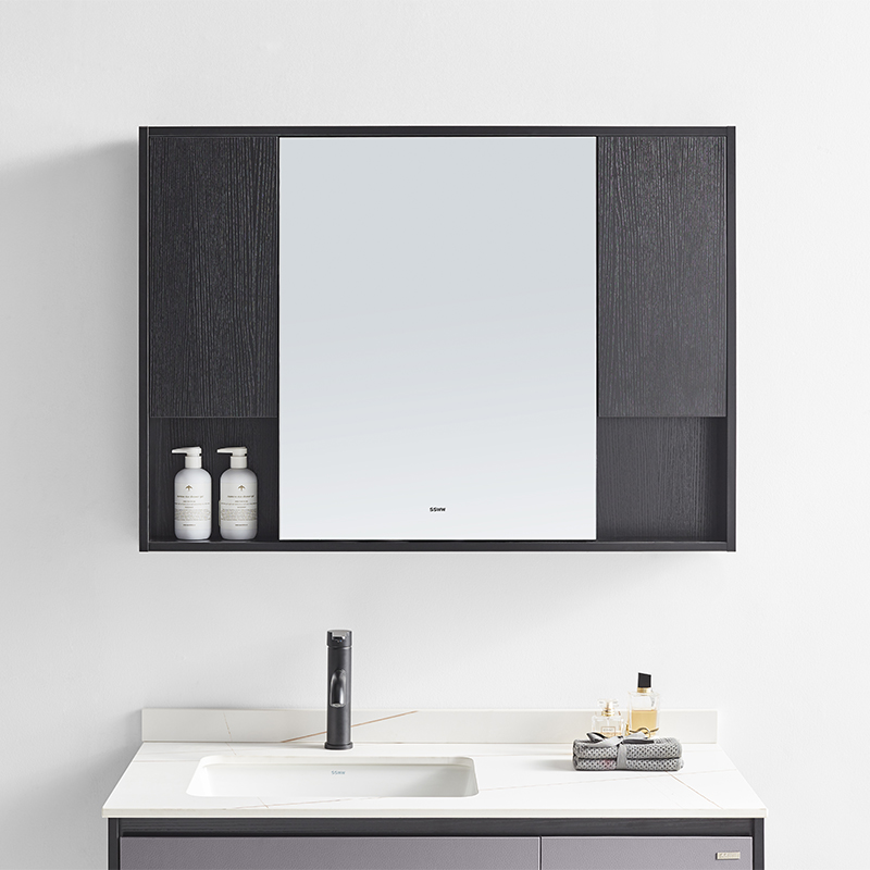 主柜含巖板臺(tái)面 : 1000×500×480mm 鏡柜 : 1000×120×707mm 材質(zhì) :多層實(shí)木板 顏色 :橄欖木皮紋 + 黑木紋