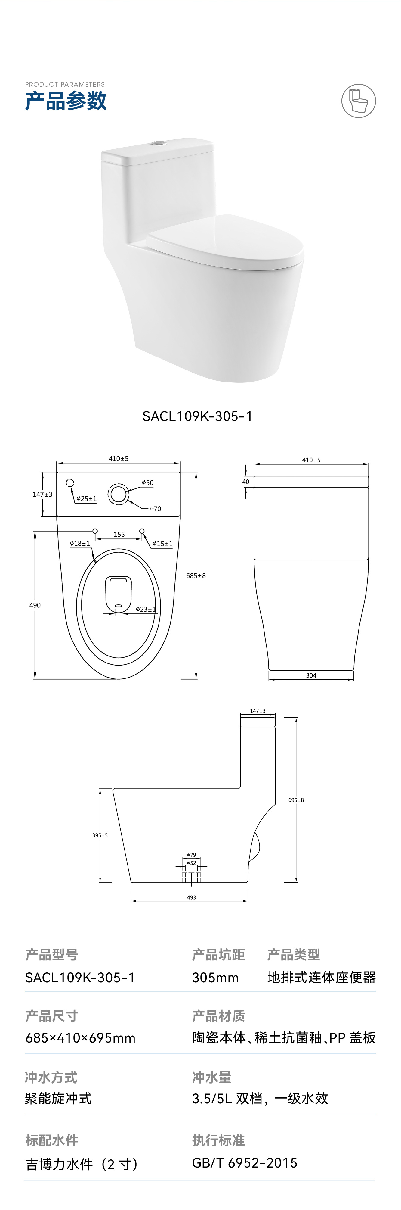 尺 寸 : 685X410X695mm 坑 距 : 300/400mm 顏 色 : 水晶白 沖水方式 : 聚能旋沖 用?水 量 : 4.0L 排污方式 : 地排污