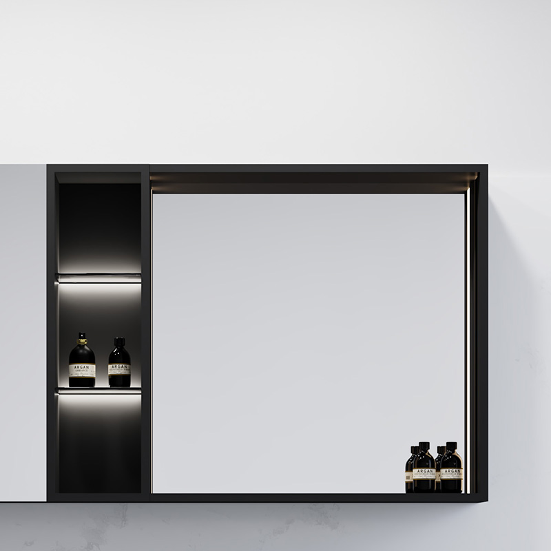 主柜 :D0095 單門主柜 (DBF028 異形拉條 )、D0097單抽盆柜 (DBF028 異形拉條 ) 馬桶掛柜 :D1086 柜體框架 ( 層板燈 ) 鏡掛柜 :D1052 單門鏡柜、D1086 柜體框架 ( 層板燈 )、D1019 開(kāi)放鏡柜 ( 帶燈 ) 臺(tái)面 : 含擋水 面板材質(zhì) : 巖板面板,鋁合金封邊 ; 鋁合金玻璃門板 陶瓷盆、龍頭、下水另外計(jì)費(fèi)