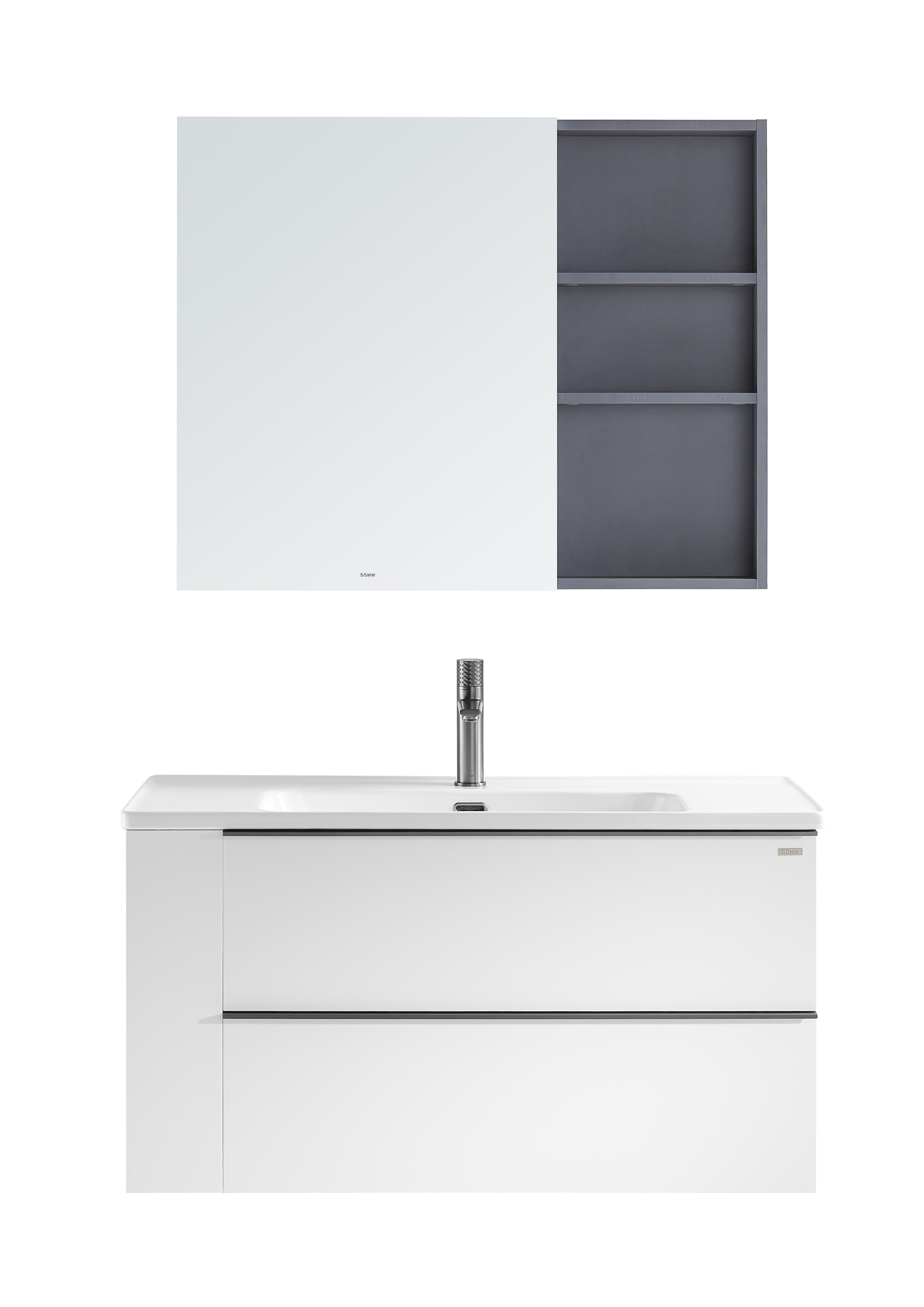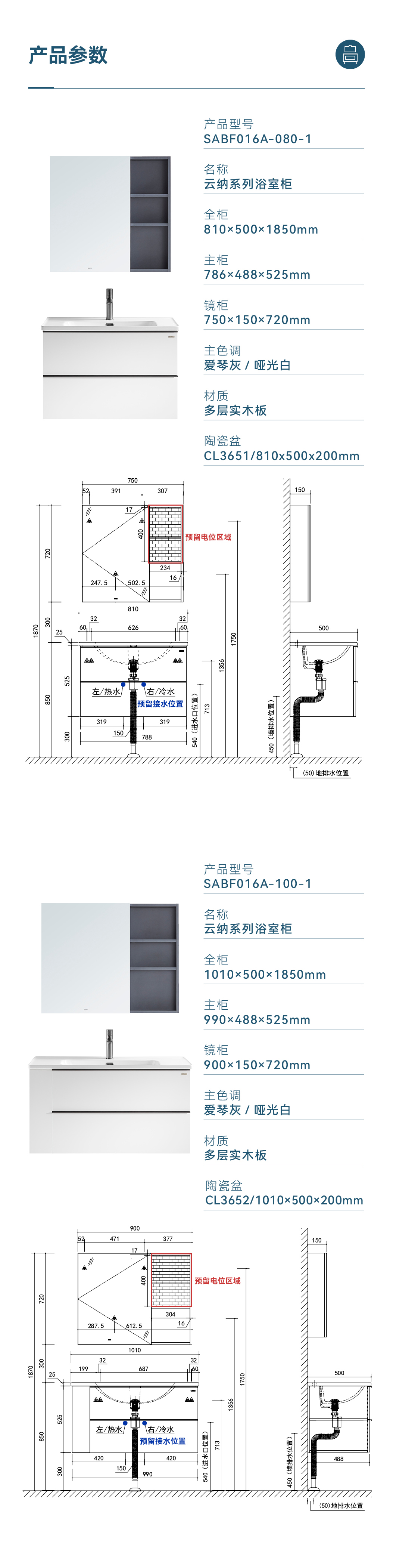 全柜:1010×500×1850mm 主柜:990×488×525mm 鏡柜:900×150×720mm 主色調(diào):愛琴灰/啞光白 材質(zhì):多層實木板 陶瓷盆:CL3652/1010×500×200mm